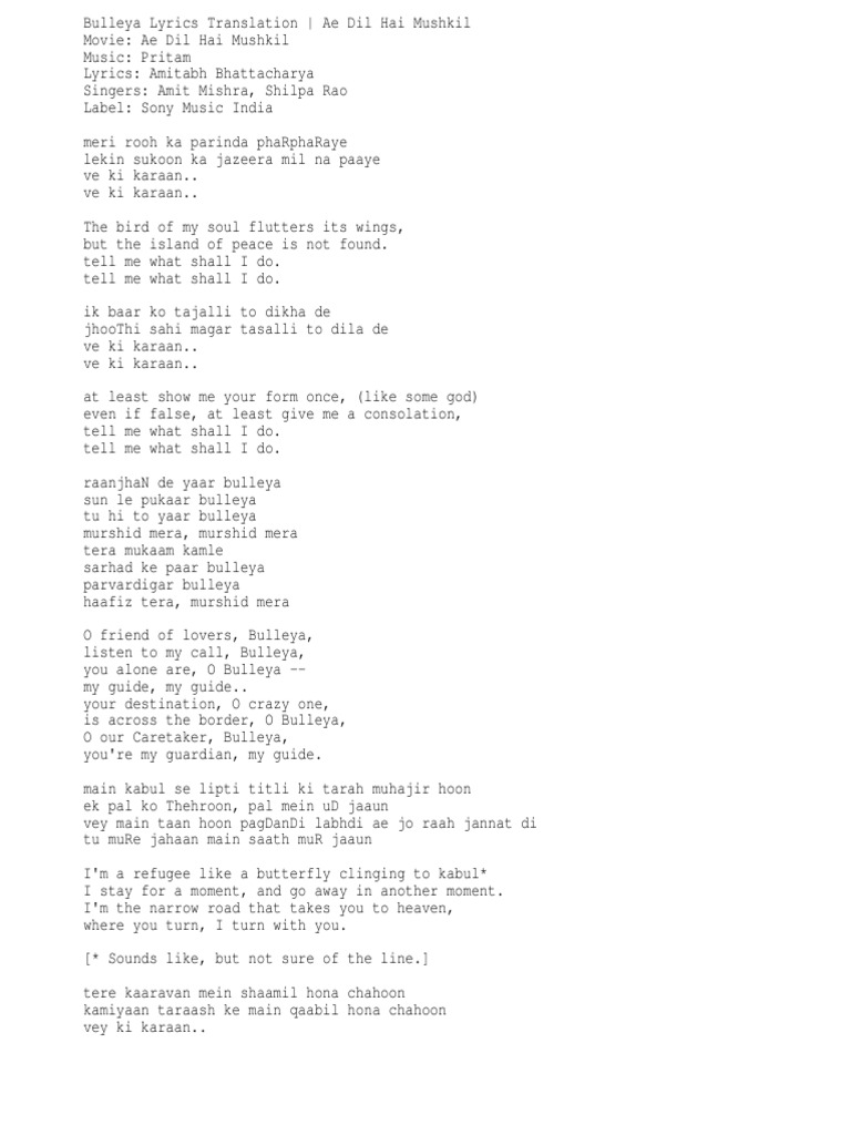 Bulleya Lyrics Translation Ae Dil Hai Mushkil Pdf Cinema Of India Bollywood